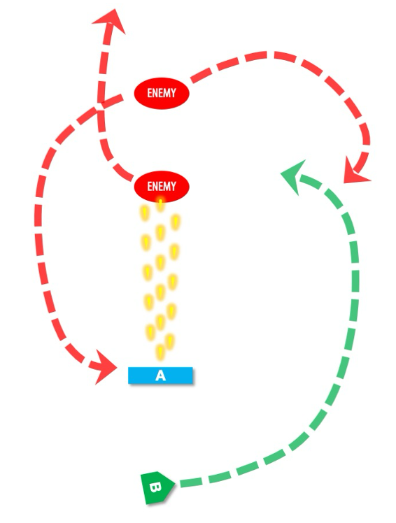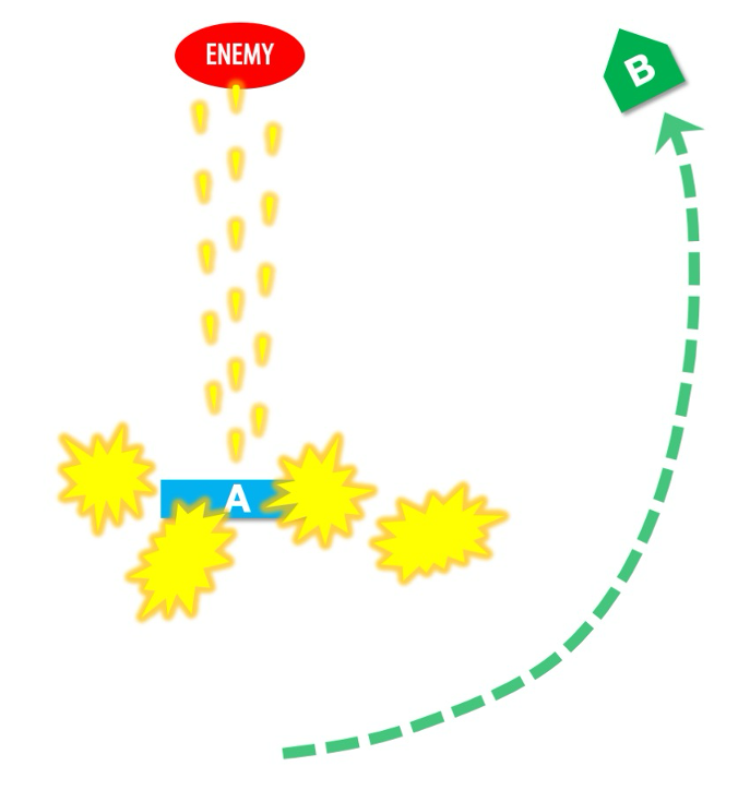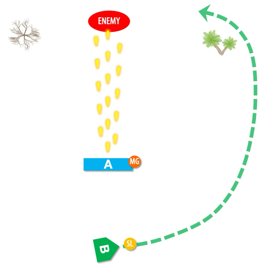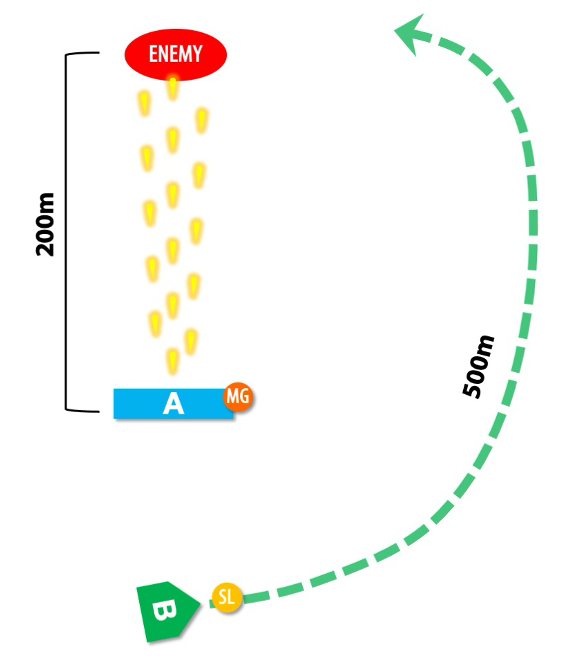 For sake of space, we assume readers are already familiar with the standard “suppress and flank” battle drill. For those who are not, refer to the diagram below. In general terms the suppress and flank battle drill involves one element (A) laying down suppressive fire while a second element (B) moves around to the right or left in a wide, bold flank to attack the enemy unexpectedly from the side.