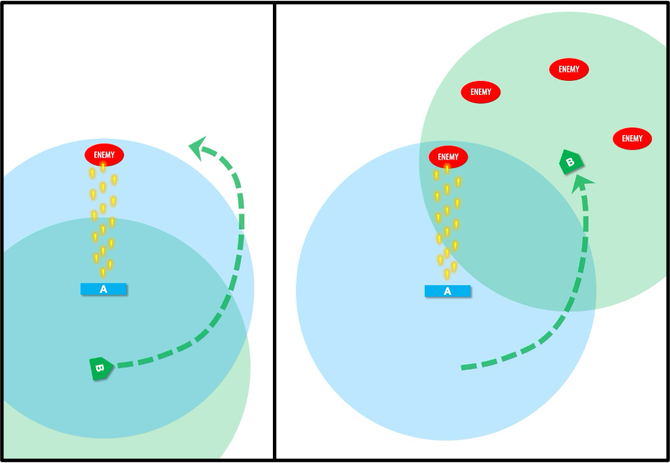 Given the engagement distances just discussed, by the time the flanking element is approaching the assault position, it will be able to see a lot farther and a lot more than the area originally visible to the support element. In the example below with shaded observation areas, the lead team understandably makes contact near the limit of its observation range and will see only one enemy element. As the trail team flanks around and moves ahead, it may see and be exposed to additional enemy elements that are not visible to the support element. The support element therefore cannot provide covering fire to help protect the flanking element from these new threats. This could leave the flanking element completely isolated while facing potentially superior forces.